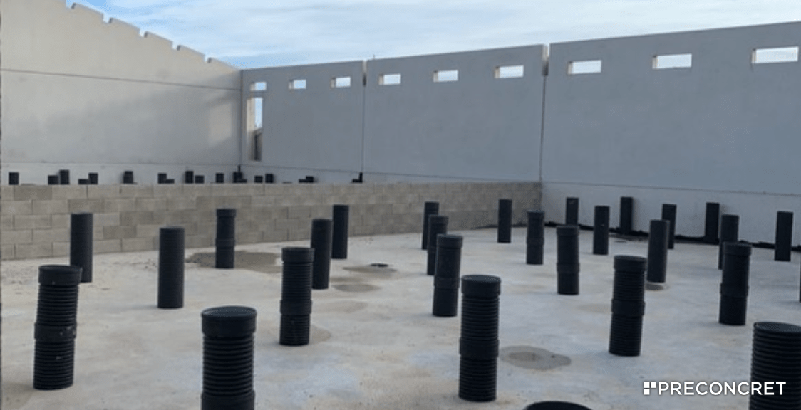 Nave ganadera de 74,80 largo x 16,00 ancho x 3,20 alto. Panel de 20 cm perimetral + 2 cerramientos interiores. Muro de fosa de 28 cm de grosor y 1,10 de alto por perímetro y 2 cerramientos interiores.