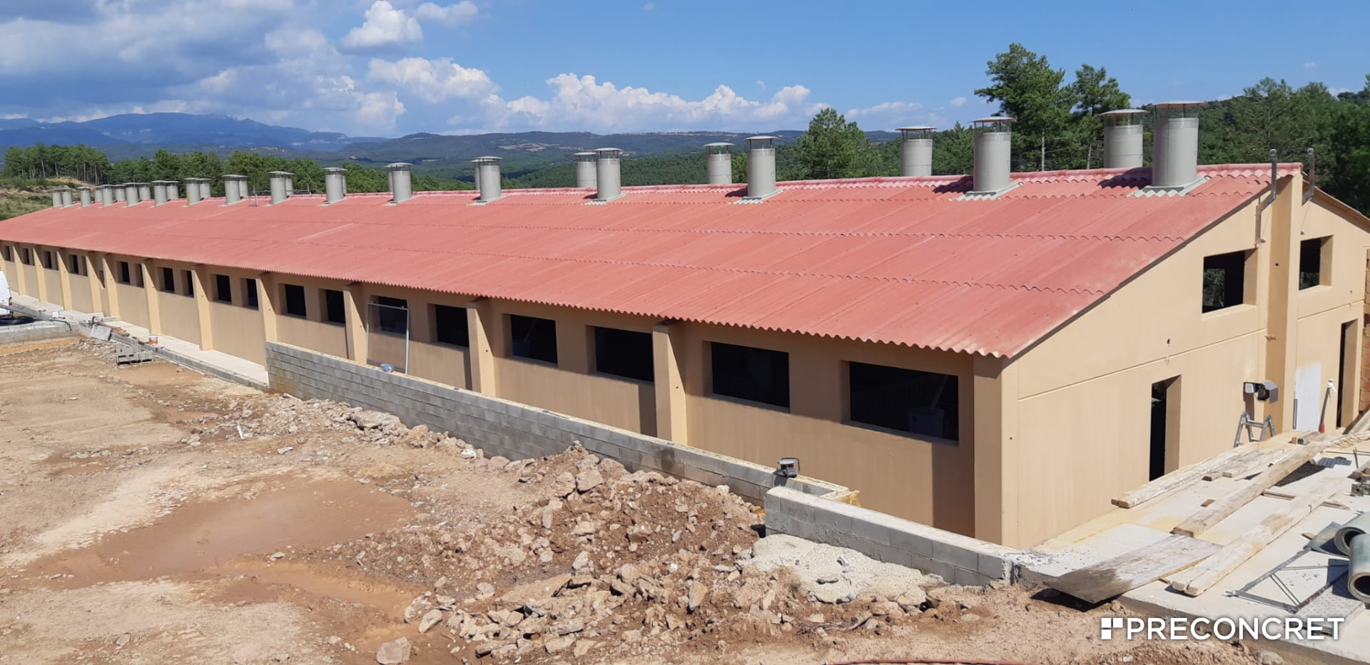 Nave ganadera de 42,00 + 3,00 + 42,00 metros de largo x 14,00 ancho x 3,20 alto. Panel de 20 cm.