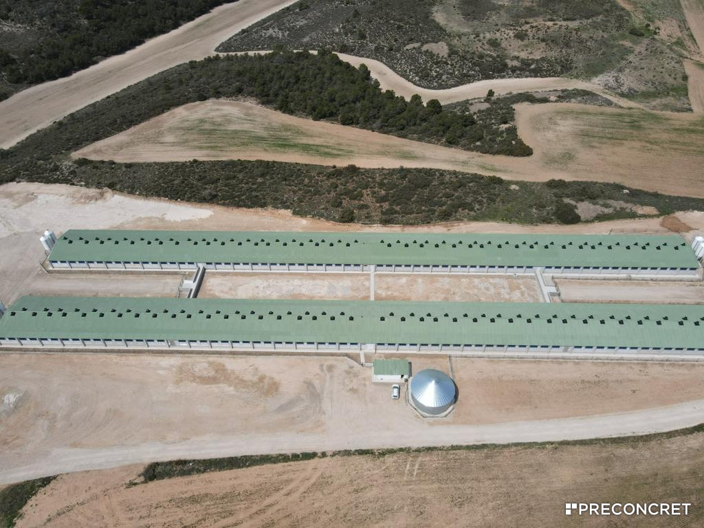 2 naves ganaderas de 102,00 + 4,00 + 102,00 de largo x 15,00 de ancho x 3,20 de altura. Panel de 20 cm.